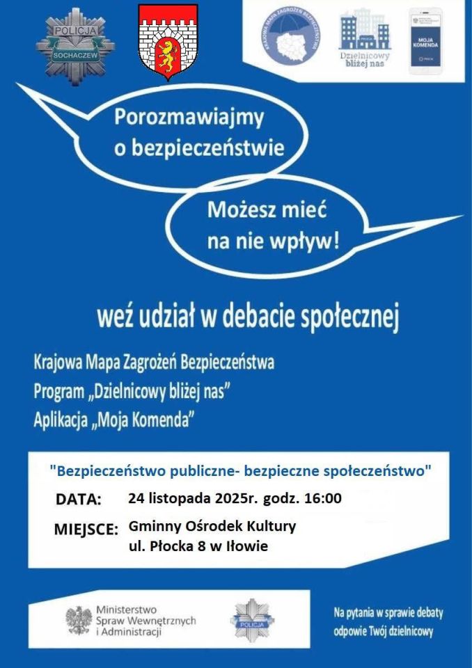 Zapraszamy mieszkańców gminy Iłów na debatę ewaluacyjną o bezpieczeństwie 24 listopada 2025 o godz. 16:00 w Gminnym Ośrodku Kultury. Omówimy wnioski mieszkańców, Krajową Mapę Zagrożeń oraz program Dzielnicowy bliżej nas.