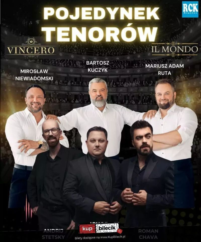 6 głosów, dwie drużyny, jeden wieczór pełen muzycznych emocji! Zapraszamy na niezwykły koncert, w którym sceną zawładnie sześciu charyzmatycznych tenorów - trzech z Polski (Bartosz Kuczyk, Mirosław Niewiadomski, Mariusz Ruta) i trzech z Lwowa (Roman Chava, Igor Radwański, Andrej Stetsky) - by stoczyć pełen pasji, głosu i sztuki pojedynek muzyczny. Dwa zespoły: Tenorzy Vincero oraz Tenorzy Il Mondo zmierzą się w przyjacielskiej, artystycznej rywalizacji, prezentując swoje największe atuty - potężne głosy, sceniczną elegancję i ogromną emocjonalność.